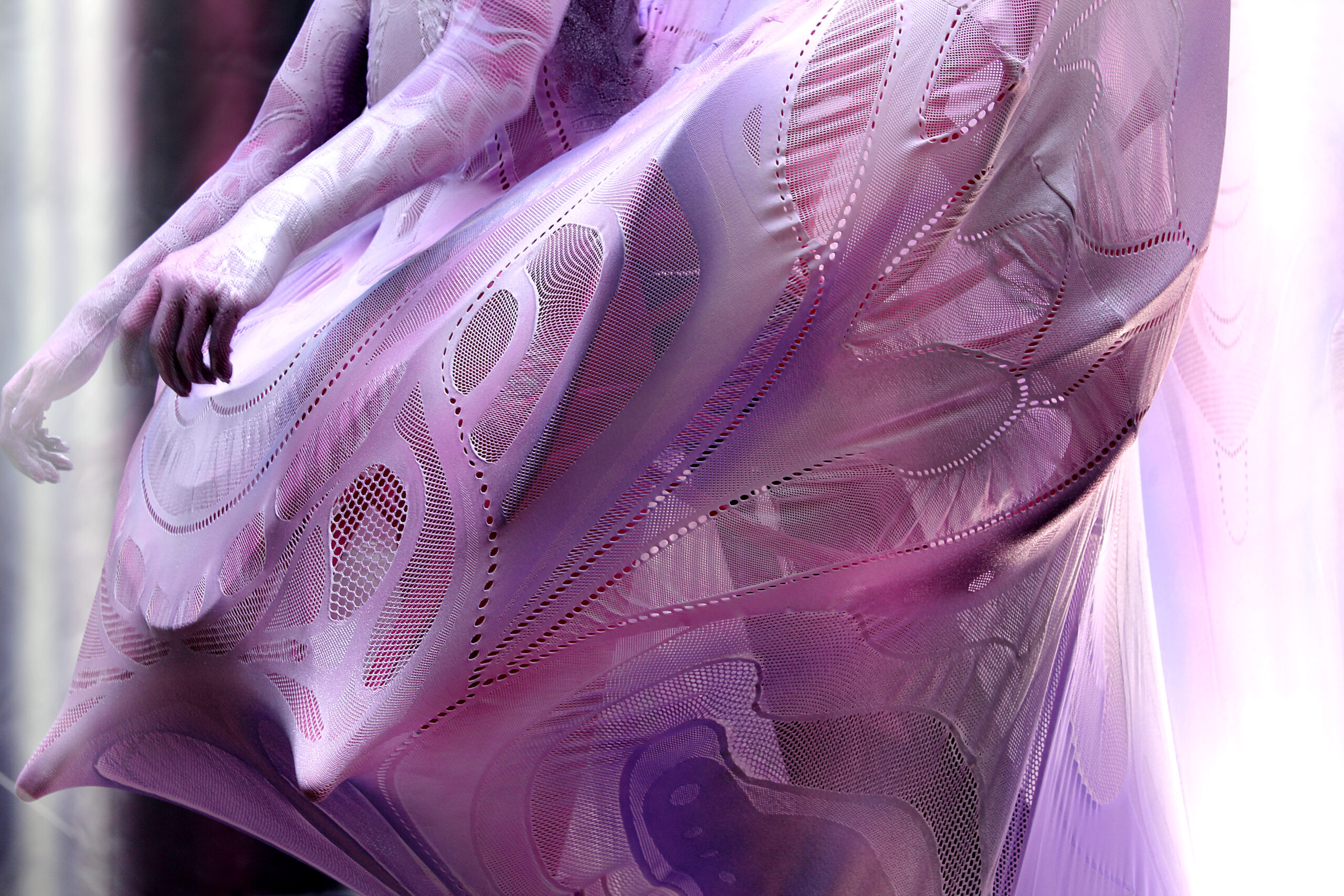 アンドロイドの身体の延長線上で骨格や外皮が拡張したイメージで構造をデザインすることから始め、耳が拡張して角になる装着型の骨格パーツと、不老不死を想起する桃のようなフォルムで、DNAのらせん構造をイメージしたウエストに装着するスカートのような外骨格を設計しました。その上に、無縫製ニット「スキンシリーズ」 をアンドロイドにまとわせる計画でしたが、複雑な骨格構造にフィットさせることや、演出上アンドロイドが高さ3mまで可動することから、衣装がその動きに追従できるのかは未知の領域でした。これまでの私たちの知見を生かして360度全方位に伸縮できるデザインを構築し、大きな伸縮にも耐えうる構造を工夫しながら編み目ひとつひとつを細胞組織のように設計して、職人の方々とともに緻密な検証を重ねて具現化していきました。