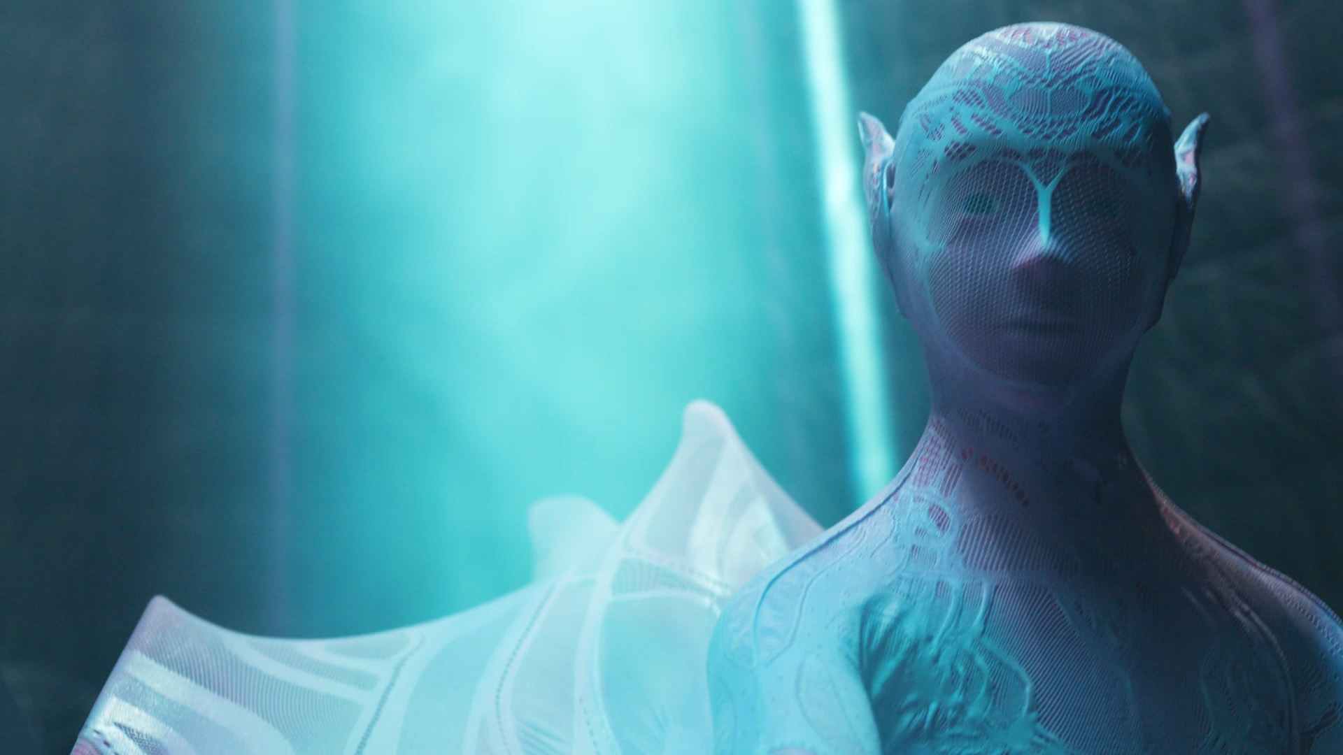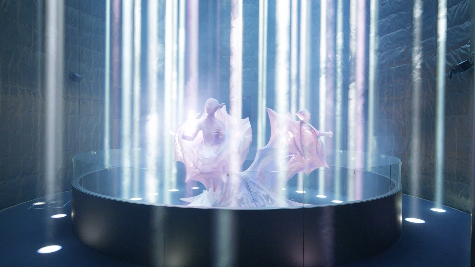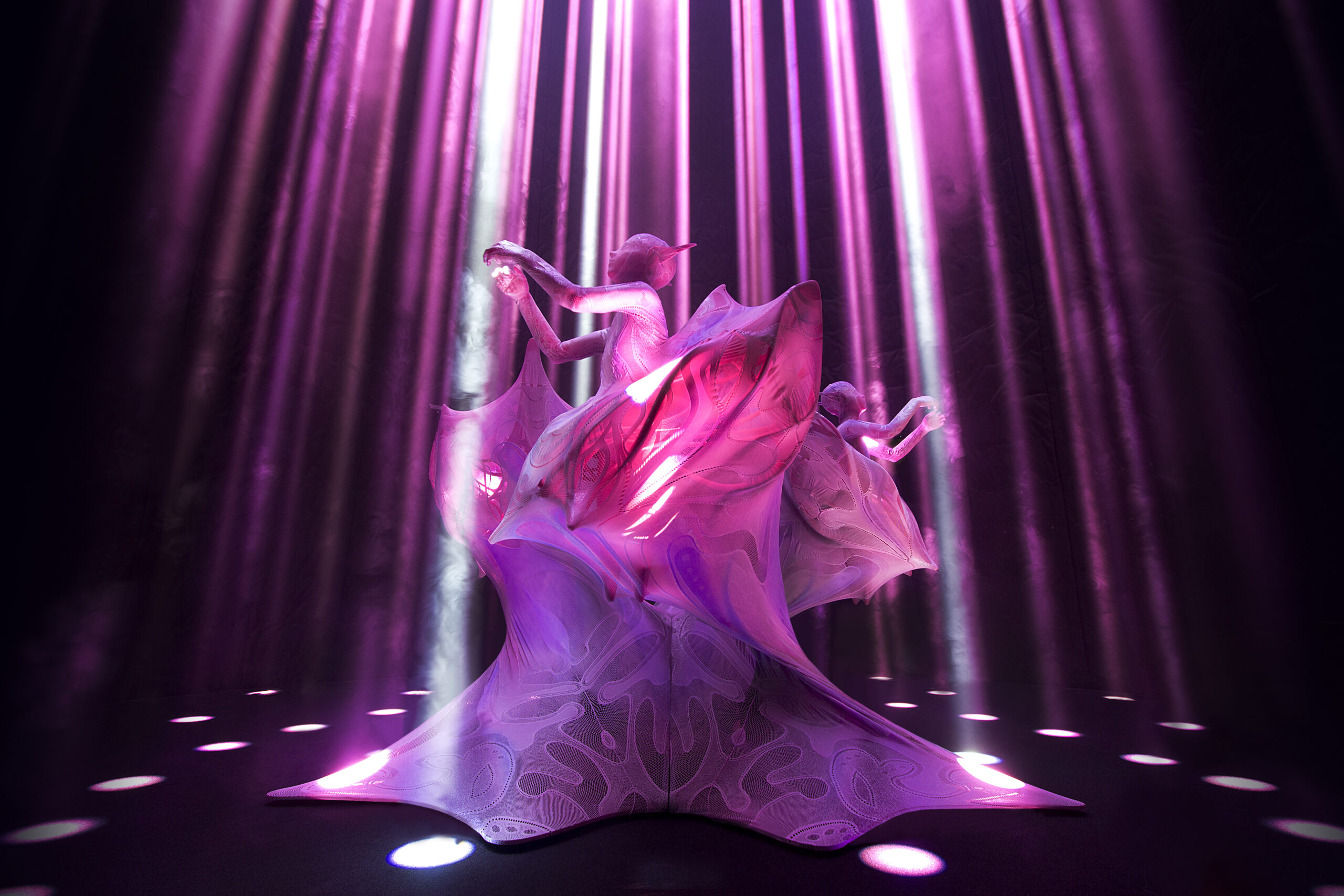 アンドロイドは1体としての存在感と、3体が一つになったときに立ち現れるミクロとマクロの「いのちの在り方」の両面を表現しています。1体では、生命の根源を象徴する渦文様をまとった美しく伸縮する外皮と、光に透けて浮かび上がる内部骨格の姿に注目していただきたいです。3体が組み合わさったときには、それぞれの渦文様が重なり合い、大きなひとつの「いのち」の形――まるでDNAのらせん構造のような美しい姿を描き出します。